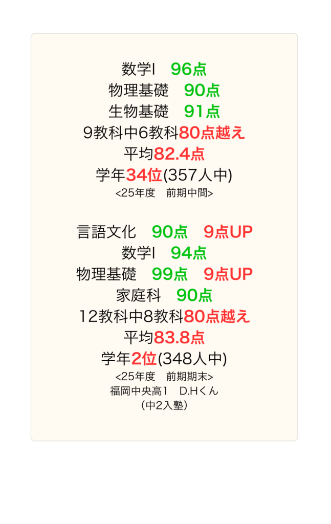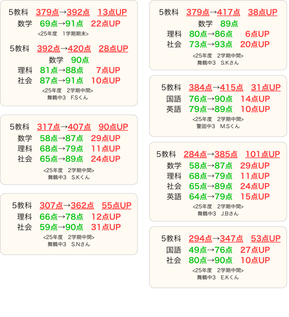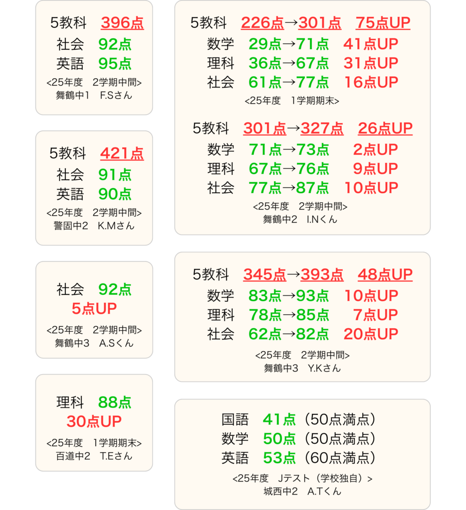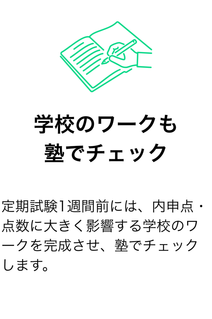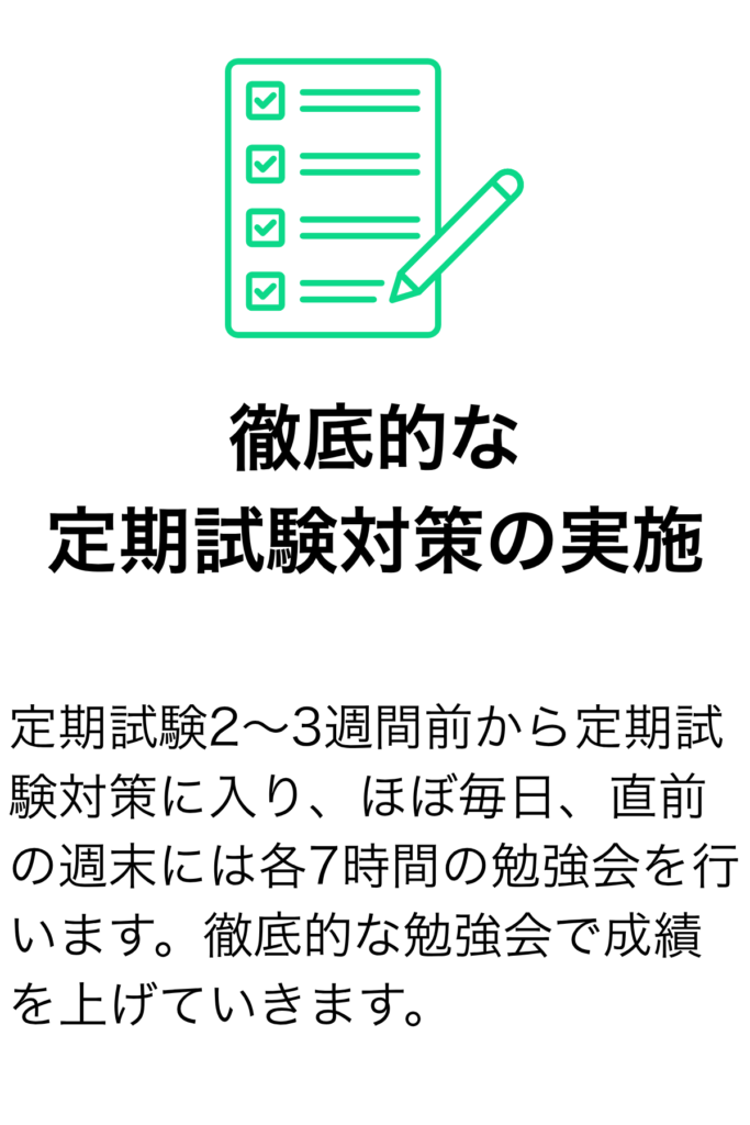 中学部では、正しい学習方法を学び、学習習慣を形成することで定期試験の成績向上を目指すとともに、高校受験・大学受験に通用する本質的な学びを提供します。